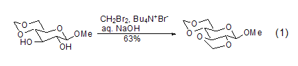 dibromomethane is an effective methylenecarboxaldehyde-forming reagent, so the reactions it participates in are usually irreversible. not only can it form cis-carboxylic aldehydes, but it can also react with sugar compounds to form stable trans-carboxylic aldehydes (formula 1)[1]. due to the presence of hydroxyl groups in the reaction substrate, the reaction can be carried out in polar solvents such as water, but requires the participation of phase transfer reagents such as tetrabutylammonium bromide.