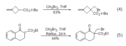 dibromomethane can also be used in alkenes monobromination of alcoholic anions. since enol anions usually produce high steric hindrance, disubstitution reactions with dibromomethane will not occur. typical examples include the bromomethylation reaction of cyclobutane carboxylate (formula 4) [4] and tetralone carboxylate (formula 5) [5] sup>.