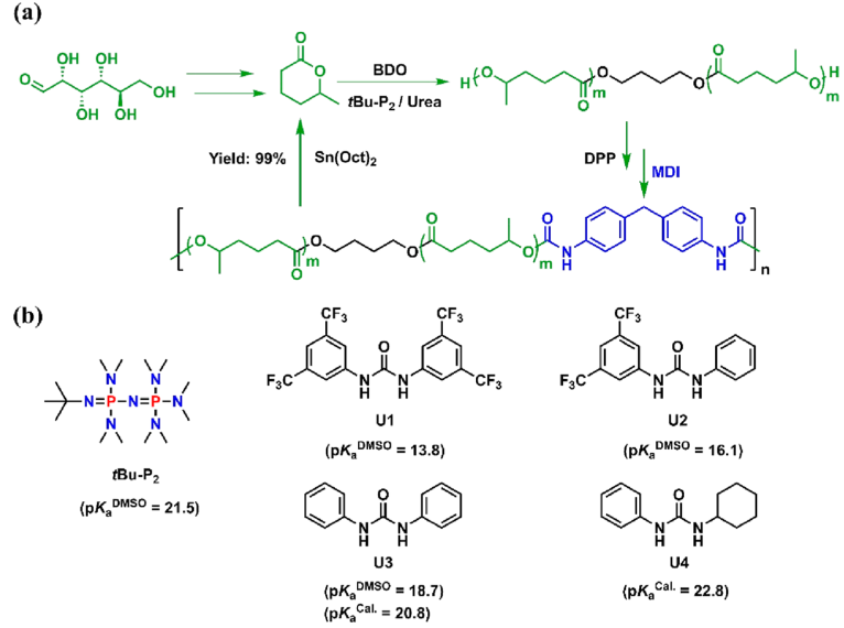 figure 1. (a) preparation of chemically recyclable polyurethanes using biobased δcl; (b) chemical structures of organic bases and ureas
