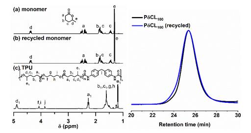 figure 4. (left) 1h nmr spectra of pristine δcl, recovered δcl, and polyurethane; (right) gpc curves of pδcl prepared from pristine δcl monomer (black line) and recovered monomer (blue line).