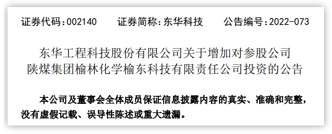 latest news: on august 20, 2022, donghua technology issued an announcement on increasing its investment in the joint-stock company shaanxi coal group yulin chemical yudong technology co., ltd.