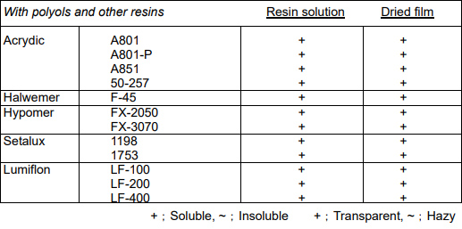 only pu grade solvents can be used (max. 0.05% water, absence of reactive groupssuch as hydroxyl or amines groups). aliphatic hydrocarbons such as hexane,cyclohexane, methylcyclohexanes and mineral spirits, are unsuitable as solventsbecause of their poor solubility.