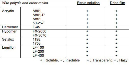 ketones and aromatichydrocarbons such as ethyl acetate, butyl acetate, methoxypropylacetate(pma), methylethyl ketone, methyl-butyl ketone, cyclohexanone,toluene, xylene, solvesso #100 andmixture thereof. generally speaking, it has good compatibility with thesolventmentioned. however, the solutions formed must be tested for their storage stability.only pu grade solvents can be used (max. 0.05% water, absence of reactive groupssuch as hydroxyl or amines groups). aliphatic hydrocarbons such as hexane.cyclohexane, methylcyclohexanes and mineral spirits, are unsuitable as solventsbecause of their poor solubility.