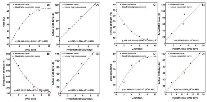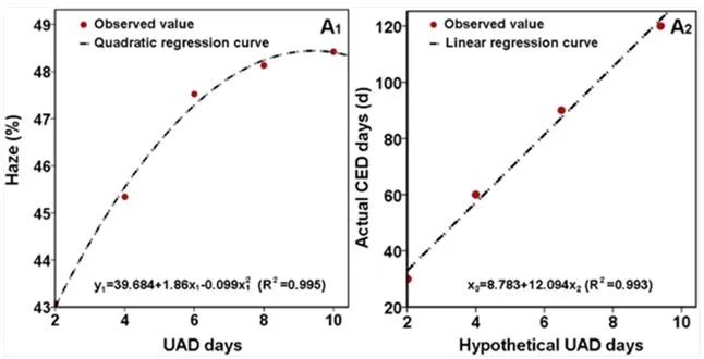 the results of the prediction model show that the best prediction results can be obtained by using the haze value of the biodegradable plastic film as the prediction index. the haze value of accelerated aging for 10 days under high temperature and ultraviolet conditions is different from that of natural aging for 120 days during the actual use in the field. the results were in good agreement (goodness of fit 0.995). therefore, the establishment of a prediction model for the service life of biodegradable plastic films can quickly predict the actual service life of this type of plastic film in the field, and provide an evaluation method for the safety prediction of the use of biodegradable plastic film products before they are put into the market. the phenomenon of crop yield reduction caused by the aging and cracking of biodegradable plastic film, and improve farmers’ confidence in using biodegradable plastic film, and promote the large-scale production and application of biodegradable plastic film. at the same time, this work can also provide theoretical guidance for the life prediction of other types of biodegradable mulch films.