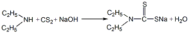 1. preparation of sodium diethyldithiocarbamate: add diethylamine and carbon disulfide to an alkali solution with a density of 1.075kg/m3 (10°bé) under stirring, and heat to 40~45°c for condensation reaction 2h, when the ph value is constant, it is the end point of the reaction. the reaction produces sodium diethyldithiocarbamate.