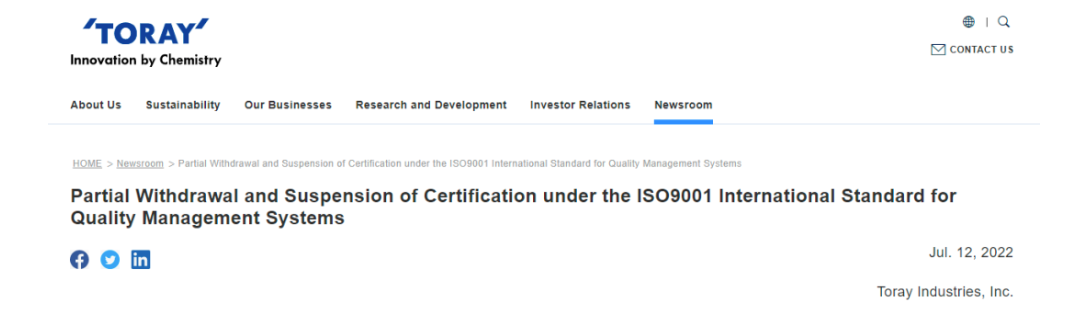 latest news: recently, toray announced on its official website the partial revocation and suspension of the iso9001 international quality management system standard certification.